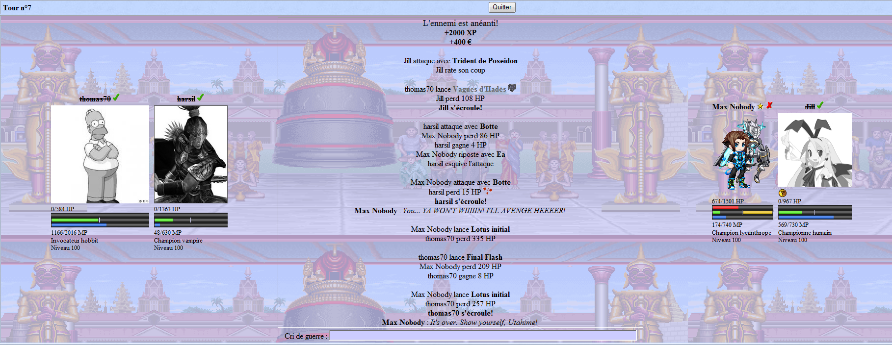 En fait y'a dû avoir 5 combats d'affilés, peut être qu'il y a des screens qui se promènent, j'ai juste voulu faire la MaJ pour la forme en attendant les screens des autre. _________________________ Groupe OVA sur FB |